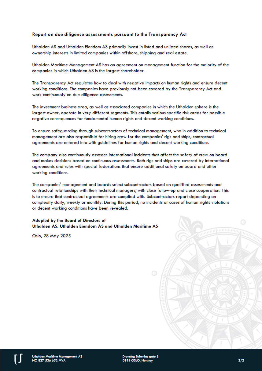 Report on Due Diligence assessments pursuant to the Transparency Act